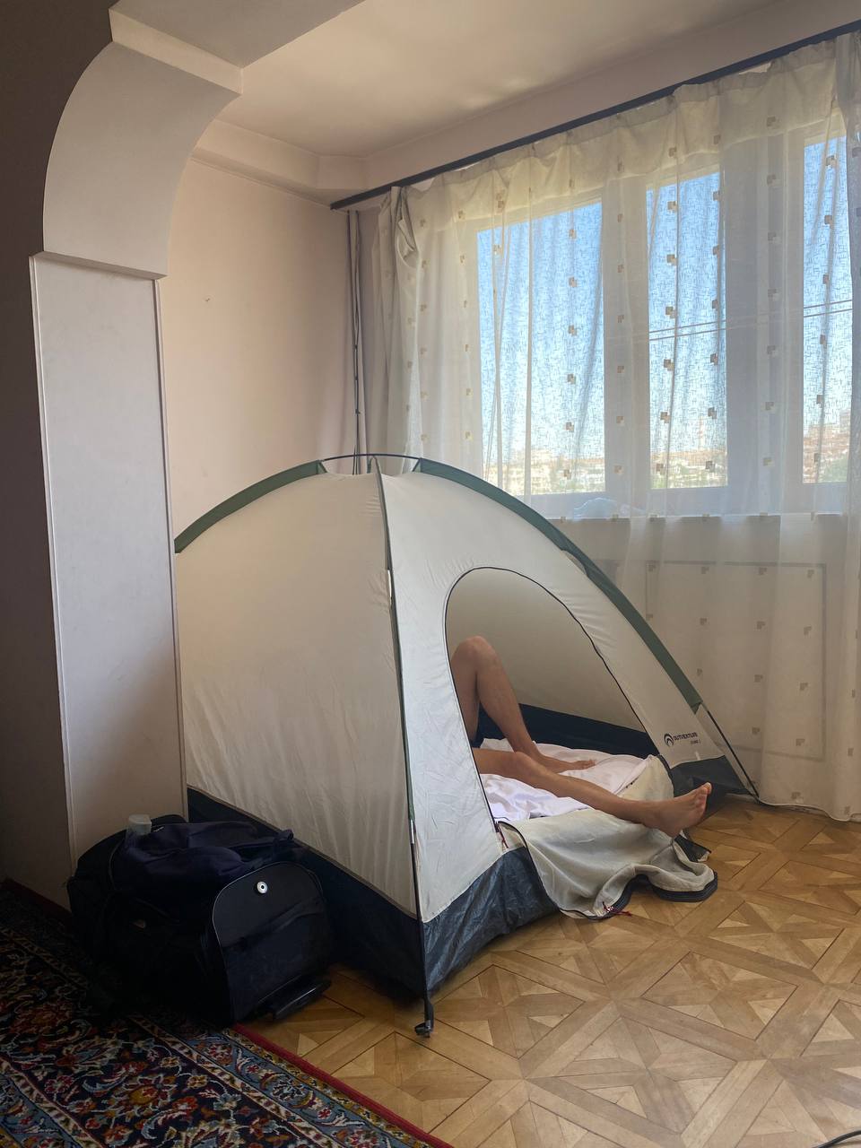 В сентябре 2022, когда началась мобилизация, в столицы в первую очередь Армении, Грузии, Казахстана, приехало невероятное количество мужчин, среди которых были и художники, поэты и другие культурные работники. В последнюю неделю месяца количество жителей нашей квартиры доходило до десяти. Это было экстремально – постоянное присутствие в пространстве твоего «дома» людей со своей делами, распорядками дня, отсутствием планов на будущее, страхами и травмами. Мне повезло, что я могла спрятаться в отдельной комнате.Еще к нам часто приходят гости.